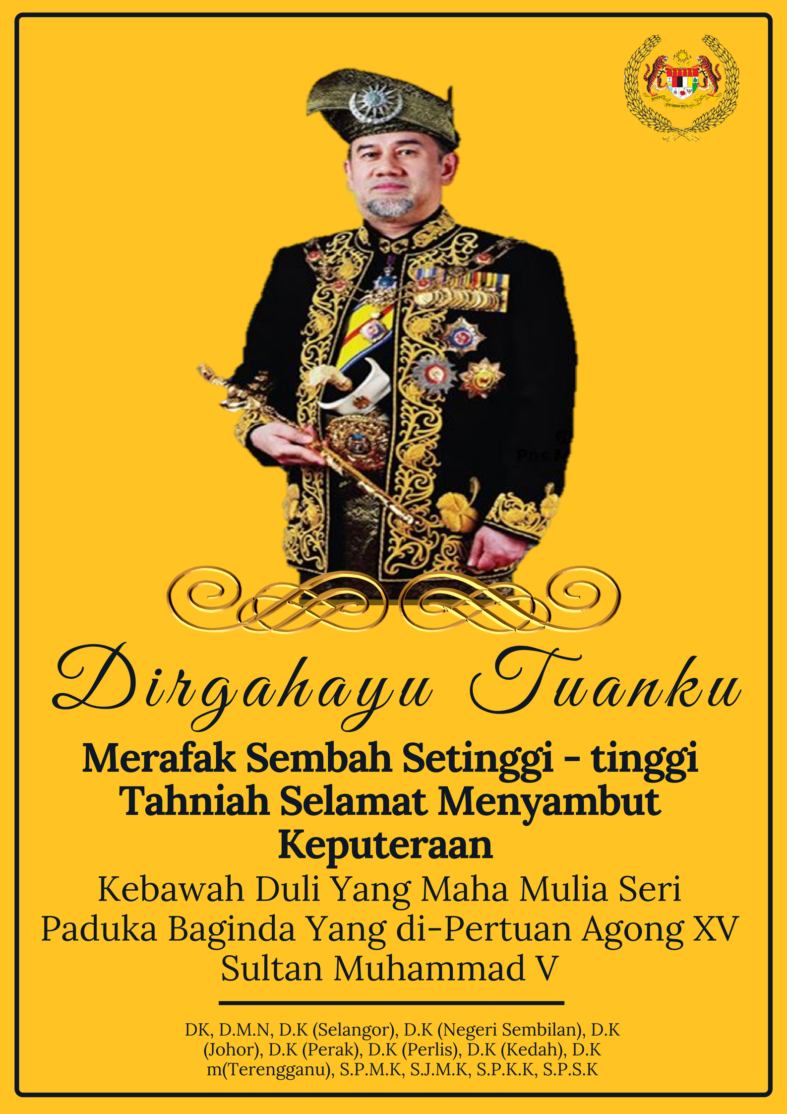 Hari Keputeraan Yang Di Pertuan Agong XV Maklumat Setempat | 3 September 2018 Makluman : Pusat Internet Taman Murai Jaya ditutup pada 9 September 2018 (Ahad) sempena cuti umum Hari Keputeraan Yang Di-Pertuan Agong XV – Sultan Muhammad V. Dirgahayu Tuanku.