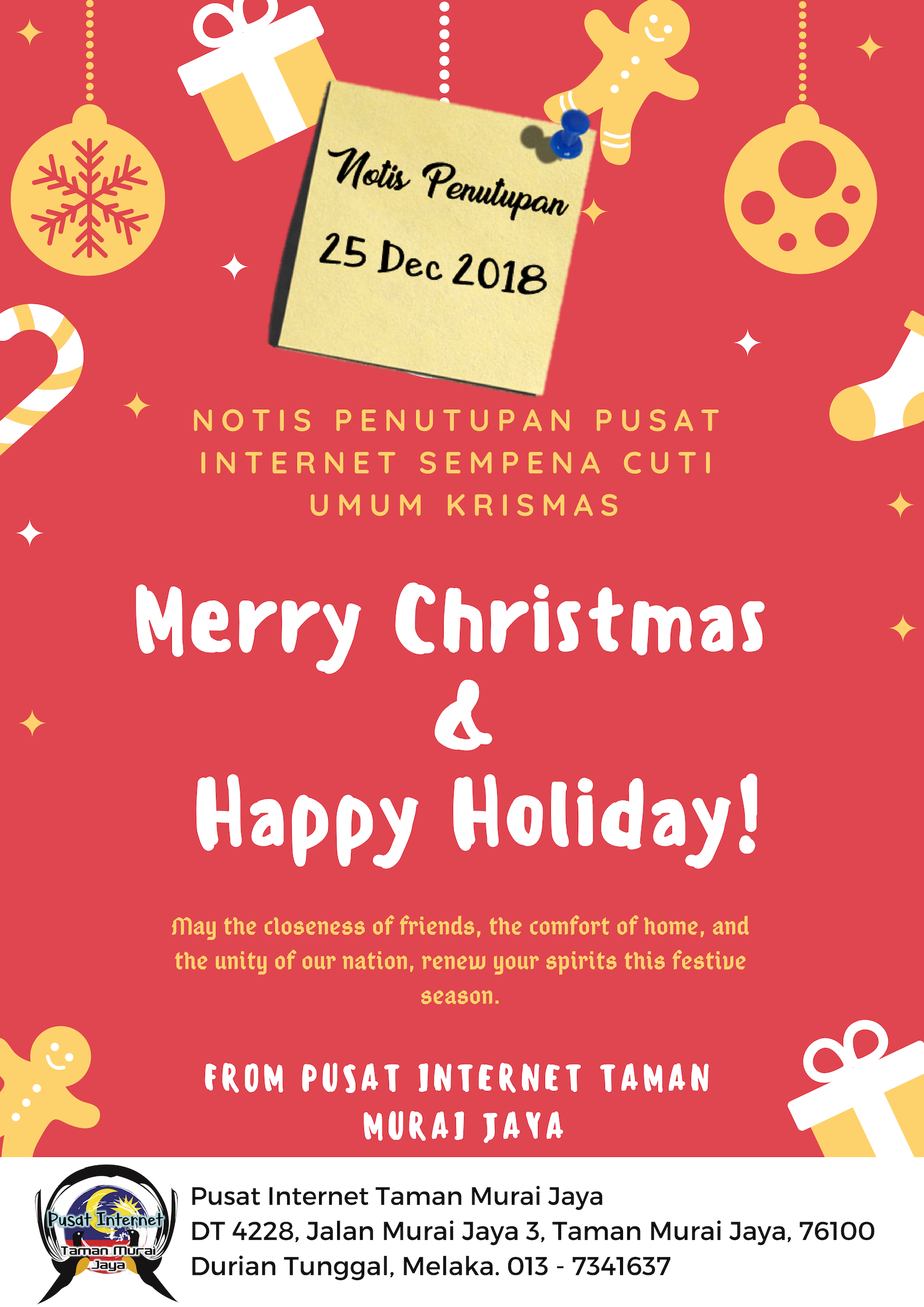 Makluman : Pusat Internet Taman Murai Jaya ditutup pada 25 Disember 2018 (Selasa) sempena cuti umum Hari Natal.